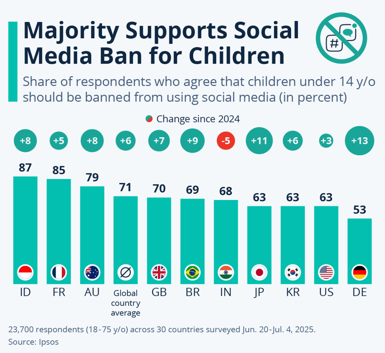 According to an Ipsos survey of more than 23,000 adults in 30 countries, average global support for banning social media use among children under 14 has reached 71%, with most regions seeing a notable rise in support compared with the previous year. (Source: SocialMediaToday / IPSOS / Statista)