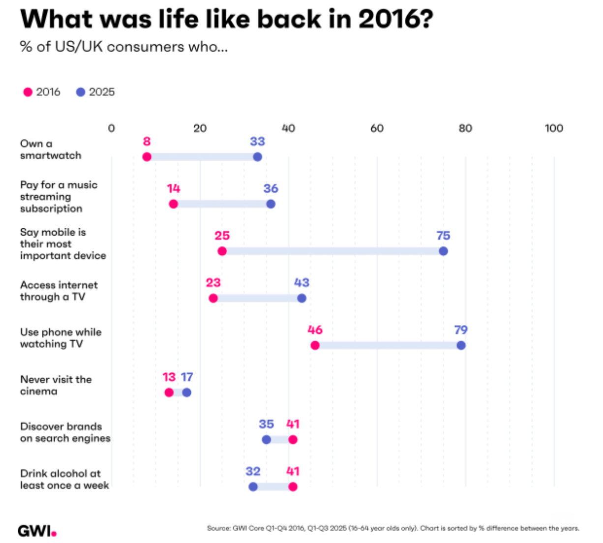 Taking a broader view reveals just how deeply embedded digital technology has become. We have shifted from a PC-first to a smartphone-first world, with second-screen viewing now close to universal. Smartwatches and smart TVs have entered the mainstream, while the past decade has been far less favourable for cinemas, search advertising and the alcohol industry. (Source: GWI)
